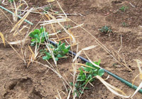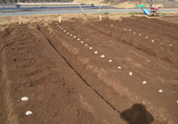 畝中央30センチ間隔で7センチの深さにジャガイモを埋めていきます