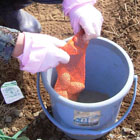 切った種芋を草木灰にまぶす。小さな種芋は切らずそのまま植えます。こちらにも灰をまぶします。